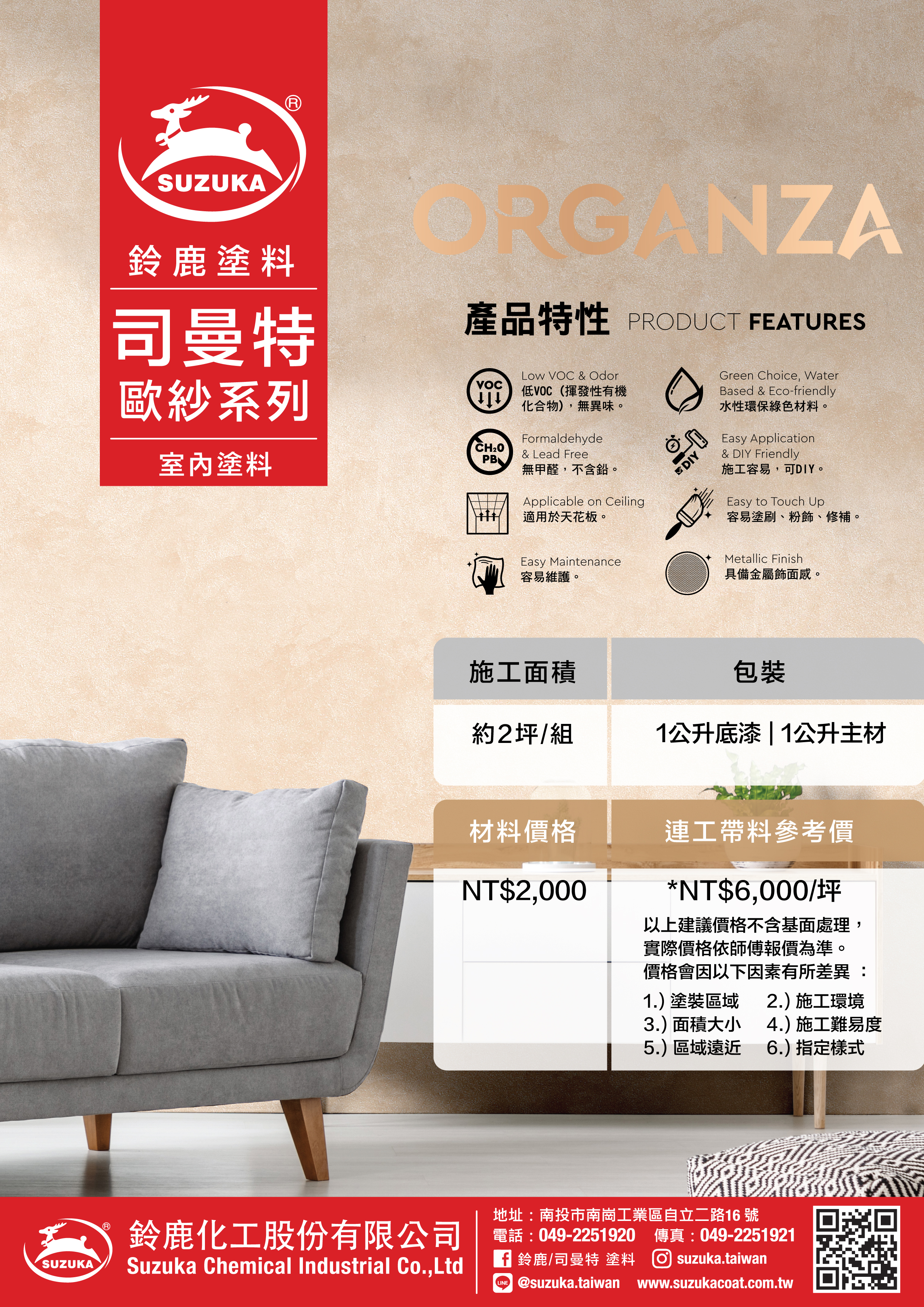 室內塗料:司曼特之歐紗系列 施工影片 觀看目錄 經銷據點 觀看牌價表 柔和又舒服的色調加上金屬飾面的處理,讓視感呈現出細緻、晶瑩 、靈動,宛如覆蓋在婚紗緞布面料上的真絲歐根紗,契合潮流又不脫古典氣息,完美呈現出室內空間的時尚感受。 SUZUKA®台灣展廳:南投市南崗工業區自立二路16號電話:049-2251920傳真:049-2251921信箱:service@suzukacoat.com.twFB:鈴鹿 / 司曼特塗料LINE ID:@suzuka.taiwan IG :suzuka.taiwan